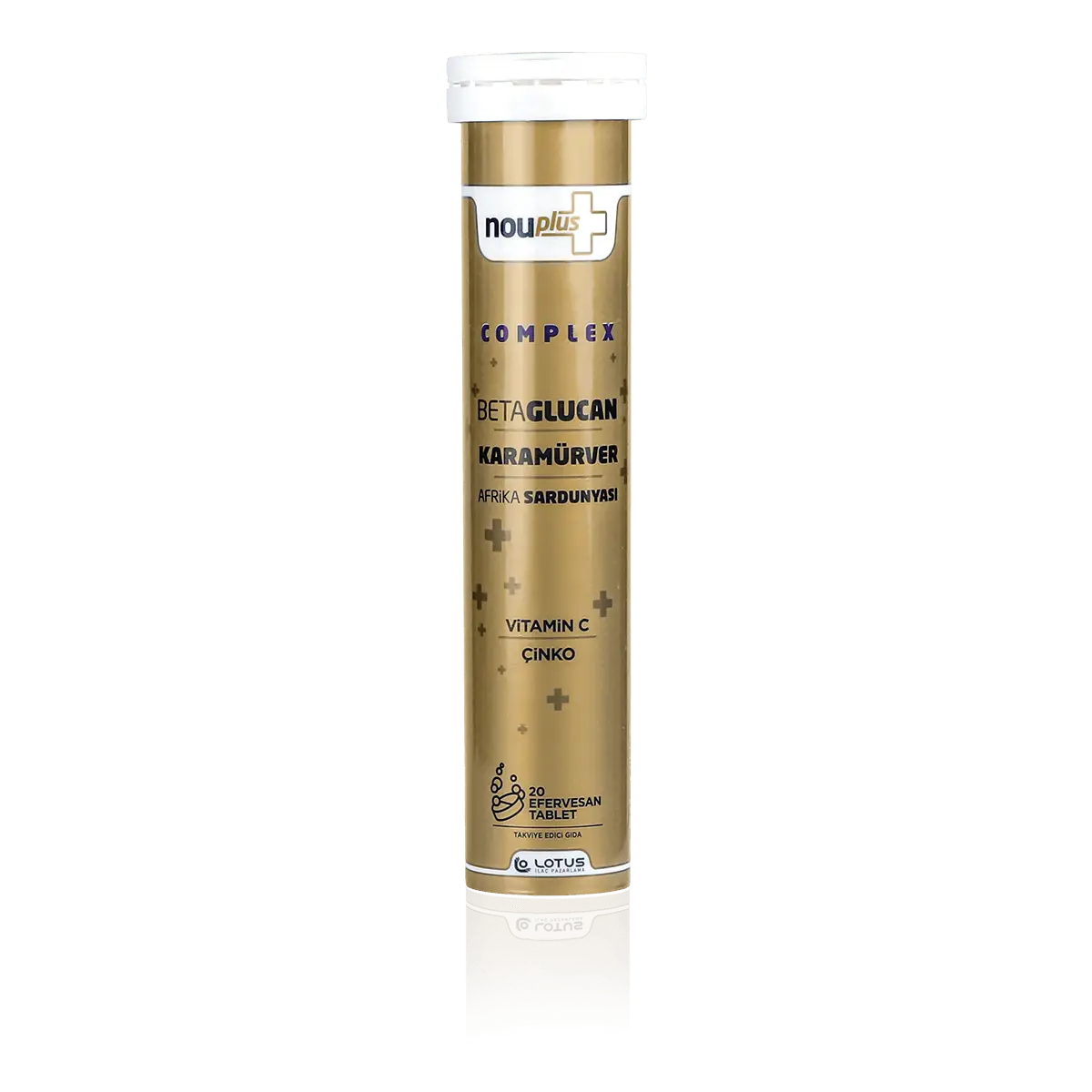Nouplus Complex, beta-glukan, kara mürver, Afrika sardunyası, C vitamini ve çinko içeren efervesan tablet formunda gıda takviyesidir.