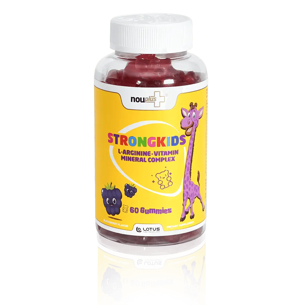 Nouplus Strongkids, çocuklar için günlük vitamin, mineral ve L-Arjinin desteği sağlayan çiğnenebilir formda gıda takviyesidir. Tablet yutma zorluğu yaşayan kişiler ve çocuklar için kullanımı kolay ve zevklidir. Böğürtlen aromalıdır.